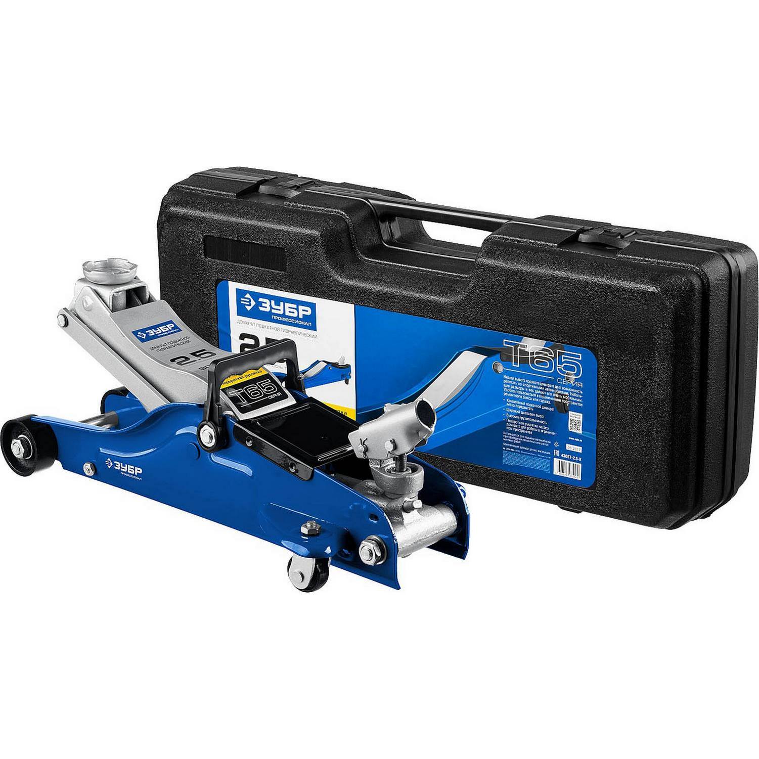 ЗУБР Т-65, 2.5 т, 90 - 360 мм, подкатной домкрат с низким подхватом и поворотной ручкой в кейсе, Профессионал (43057-2.5-K)