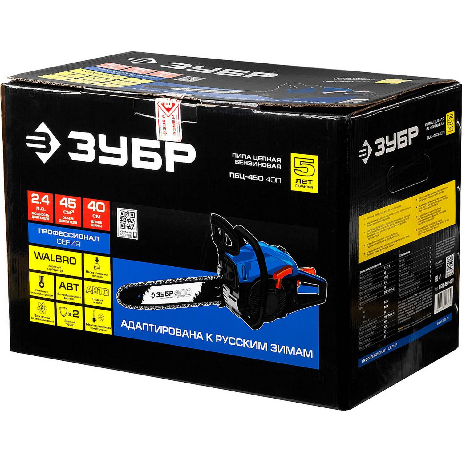 Пила цепная бензиновая, ЗУБР Профессионал ПБЦ-450 40П, хромир. цилиндр, праймер, 45 см3 (1.8 кВт), шина 400 мм, 10800 об/мин