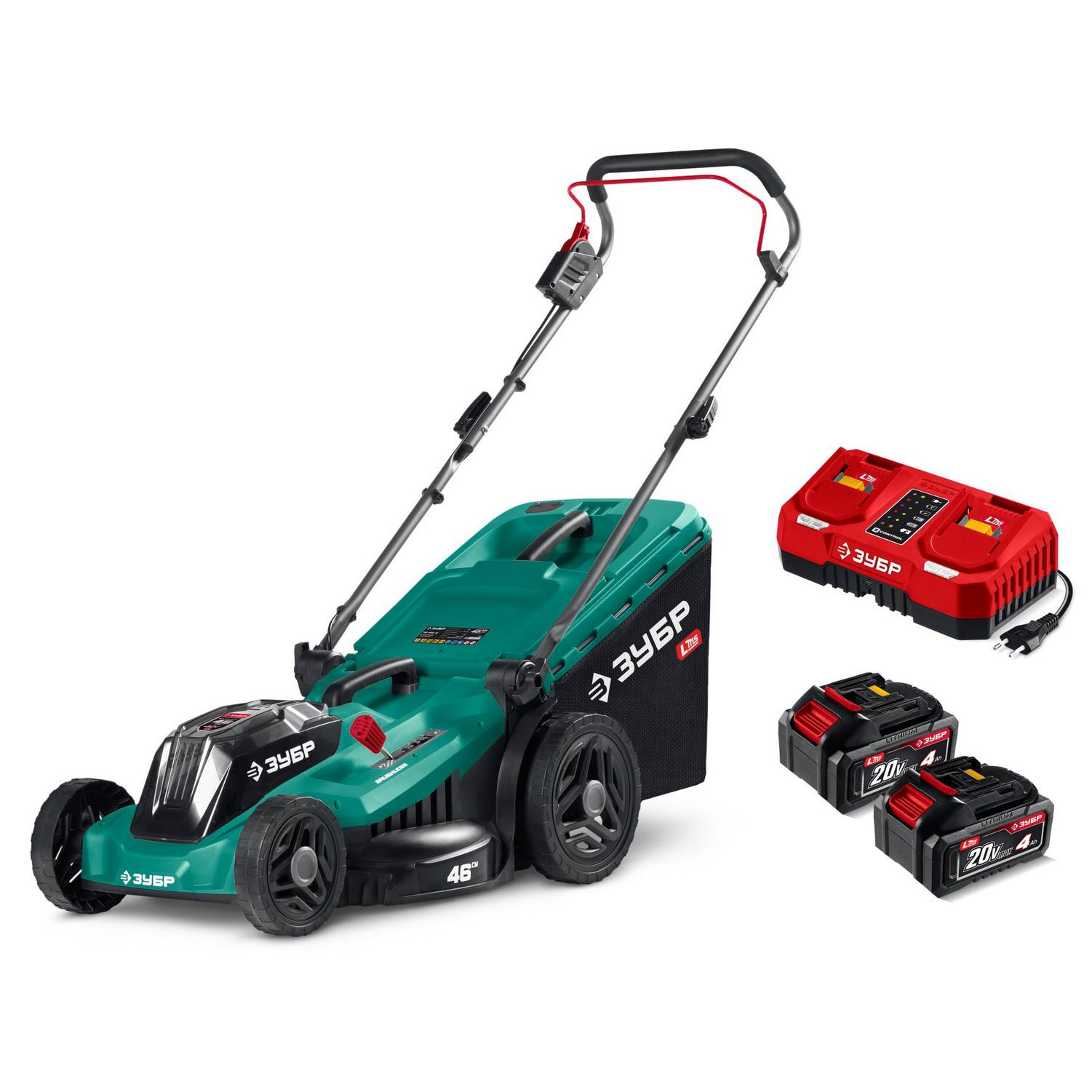 ЗУБР 40 В (2x20В), 460 мм, 2 АКБ LMS (4 Ач), газонокосилка аккумуляторная бесщеточная {ГКЛ-4046-42}