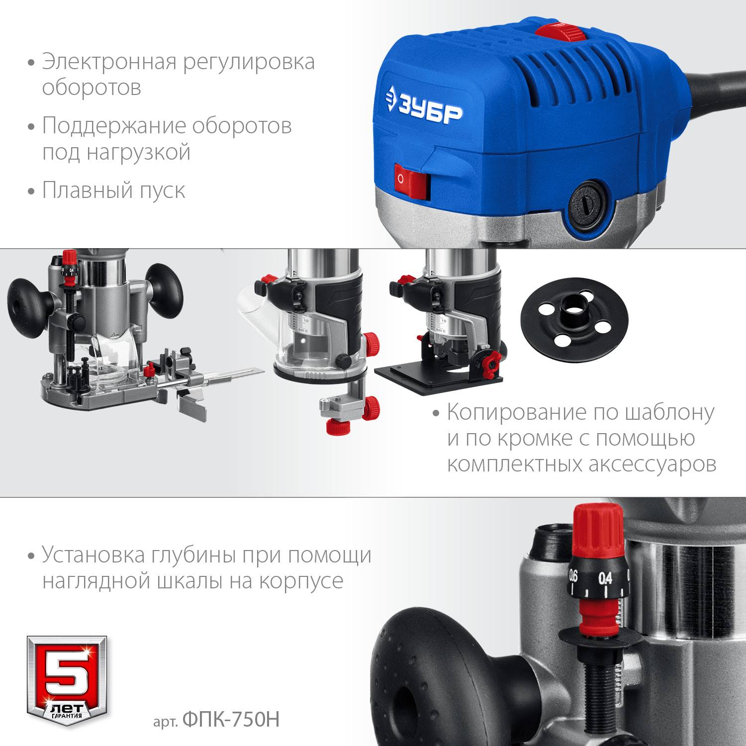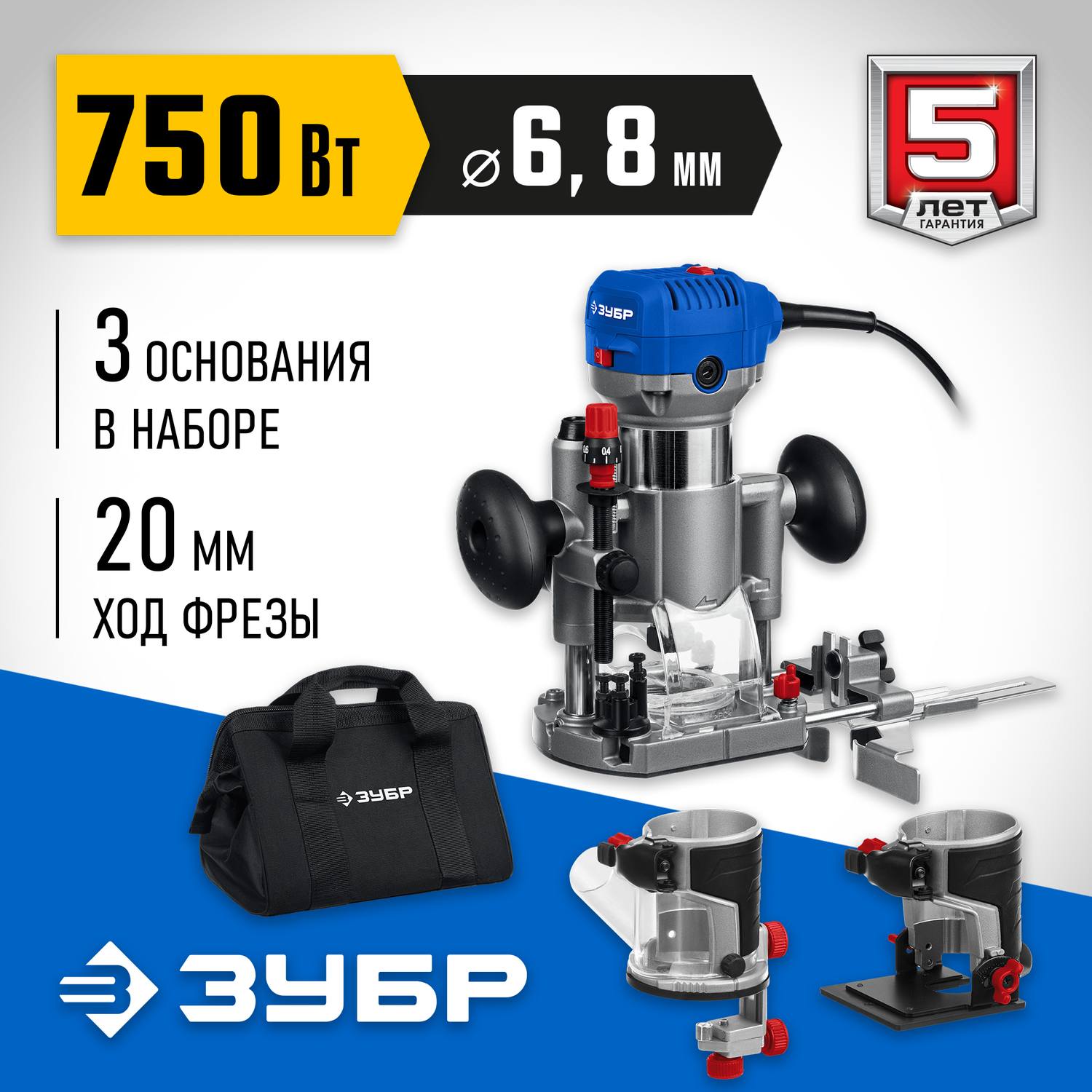 ЗУБР 750 Вт, кромочный фрезер, сумка, 3 основания, Профессионал {ФПК-750Н}