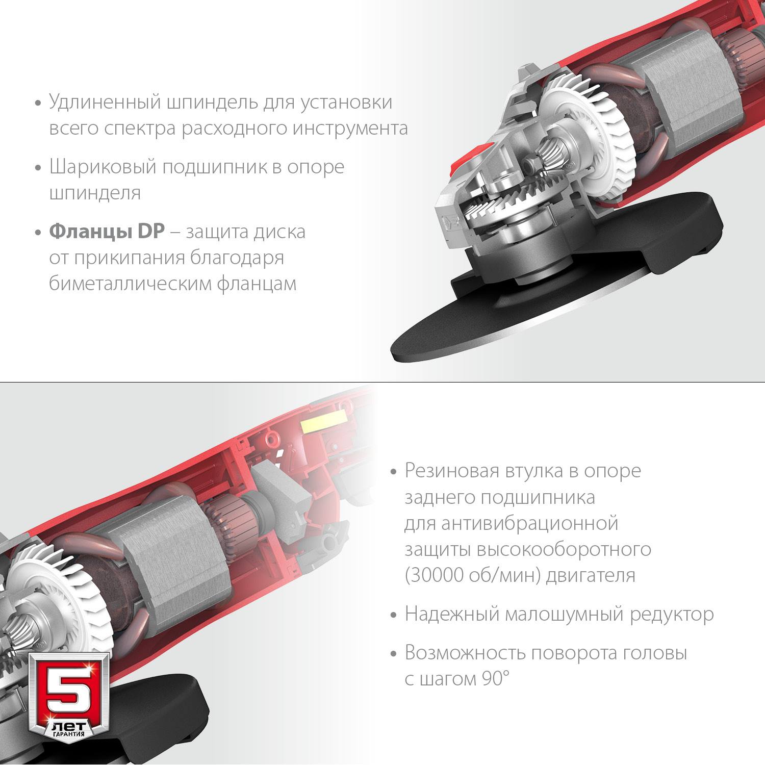 Угловая шлифмашина ЗУБР УШМ-230-2605 П, предназначена для зачистки, шлифовки и резки металлов, обработки бетона и камня при установке соответствующих шлифовальных, отрезных, алмазных кругов. Наиболее мощная модель в линейке ЗУБР с максимальными характеристиками для домашнего мастера. Специально разработанный корпус редуктора для улучшения теплоотвода и обеспечения прочности самого нагруженного узла. Система плавного пуска позволяет включать мощный двигатель без рывка и пусковой перегрузки. Удобная блокировка шпинделя для простой смены диска. Специальная конструкция щеткодержателя, предотвращающая повреждение коллектора при полном износе щеток. Быстрый доступ к щеткам для замены.