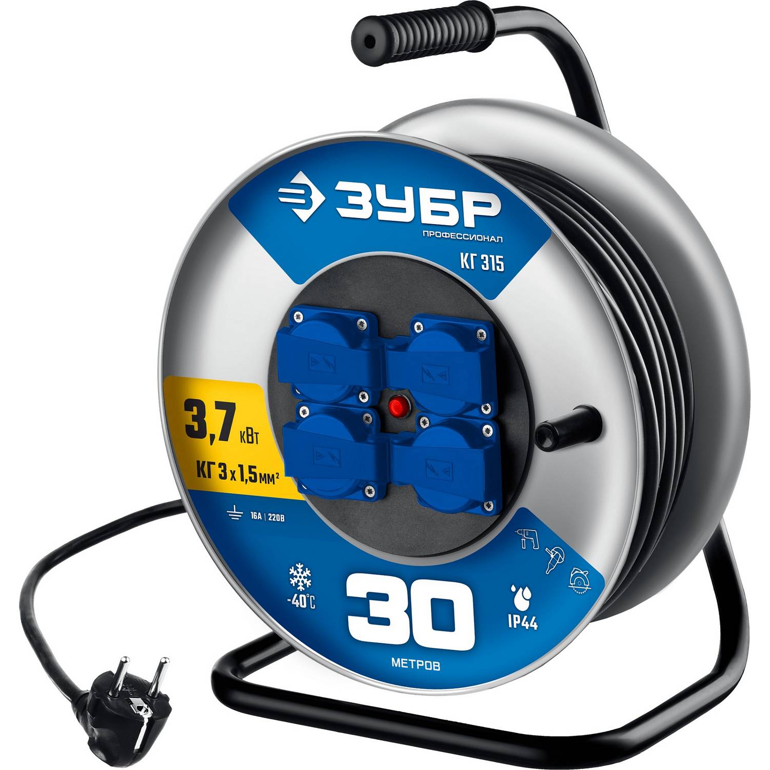 ЗУБР КГ-315, КГ, 3 x 1.5 мм2, 30 м, 3700 Вт, IP44, силовой удлинитель на стальной катушке, Профессионал 55080-30_z01}