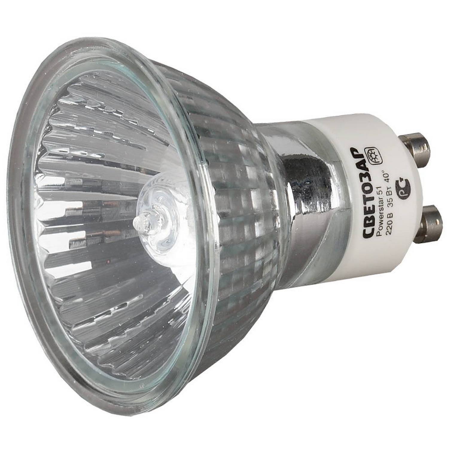 Лампа галогенная СВЕТОЗАР с защитным стеклом, алюм. отражатель, цоколь GU10, диаметр 51мм, 50Вт, 220В