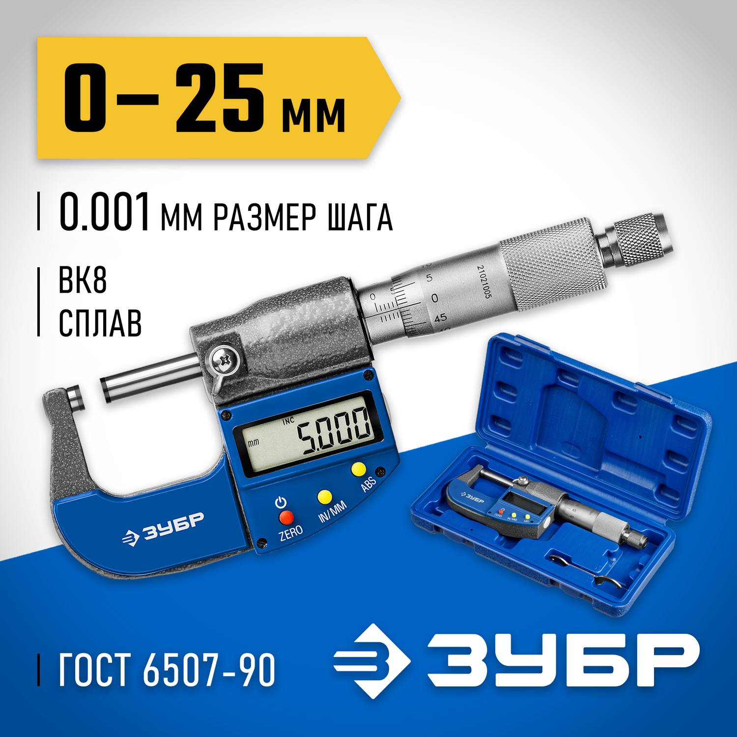 Микрометр ЗУБР "Профессионал" гладкий цифровой, МКЦ 25, диапазон 0-25мм, шаг измерения 0,001мм {34482-25_z02}
