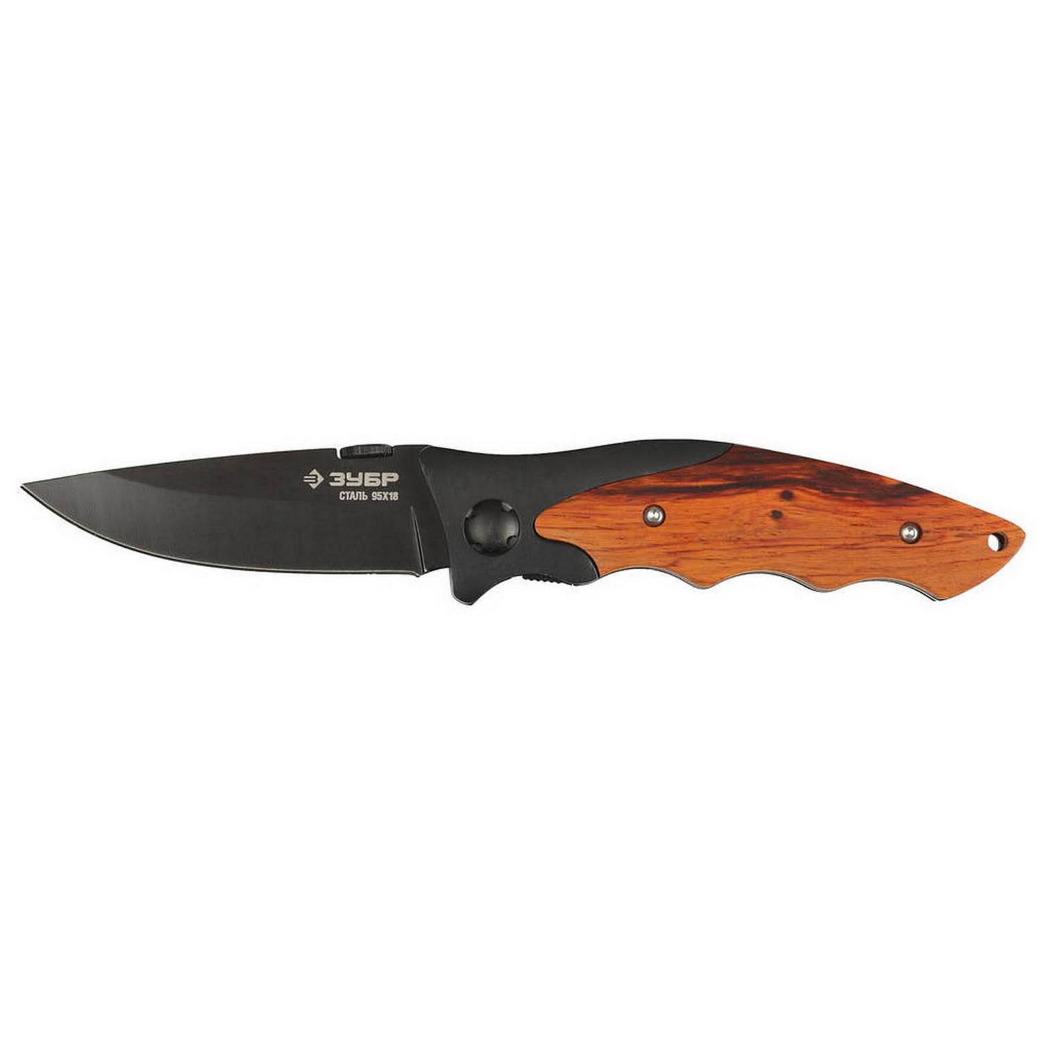 ЗУБР Стрелец, 185 мм, лезвие 80 мм, металлическая рукоятка, с деревянными вставками, складной нож (47711)