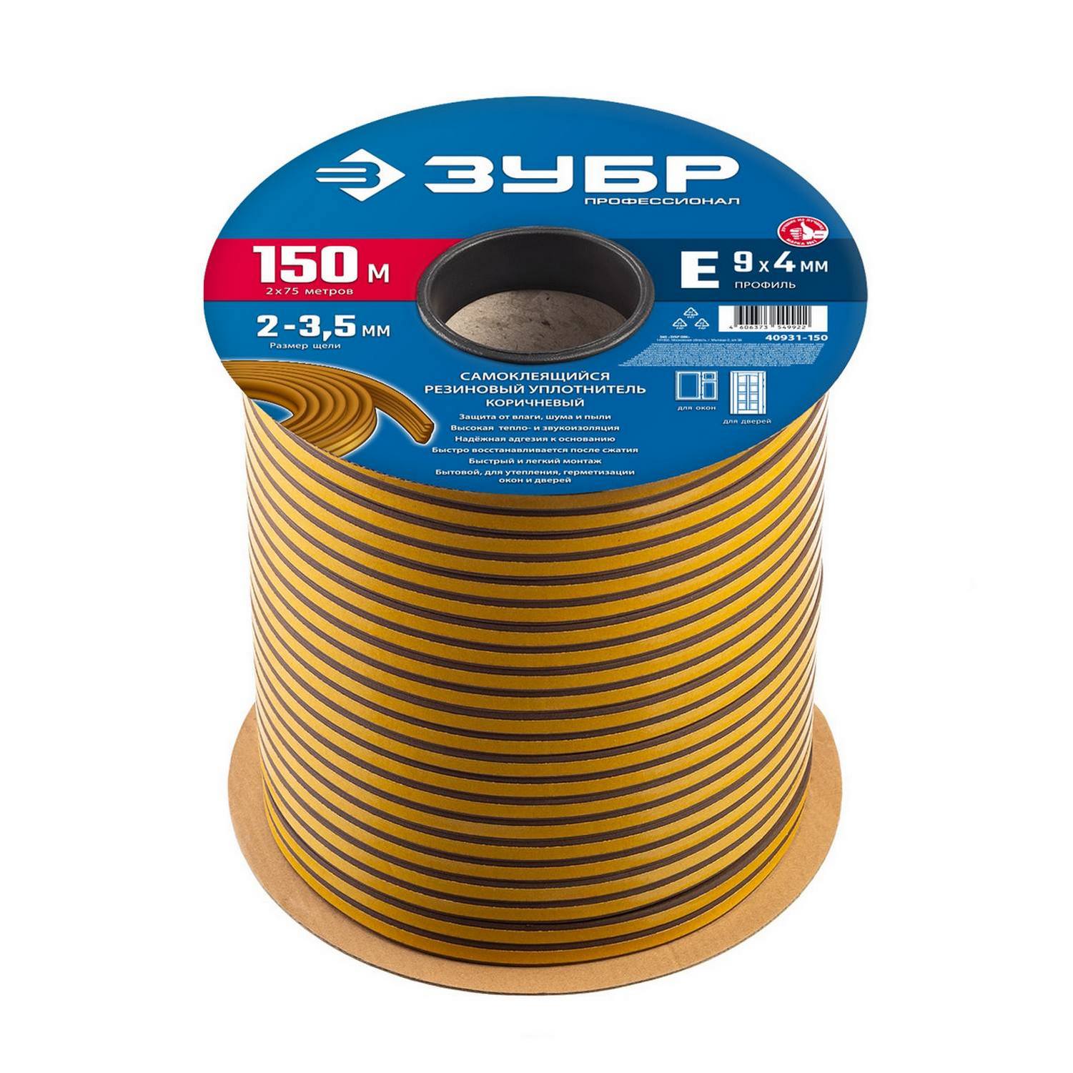 ЗУБР 150 м, E-профиль, размер 9 х 4 мм, коричневый, самоклеящийся резиновый уплотнитель, Профессионал (40931-150)