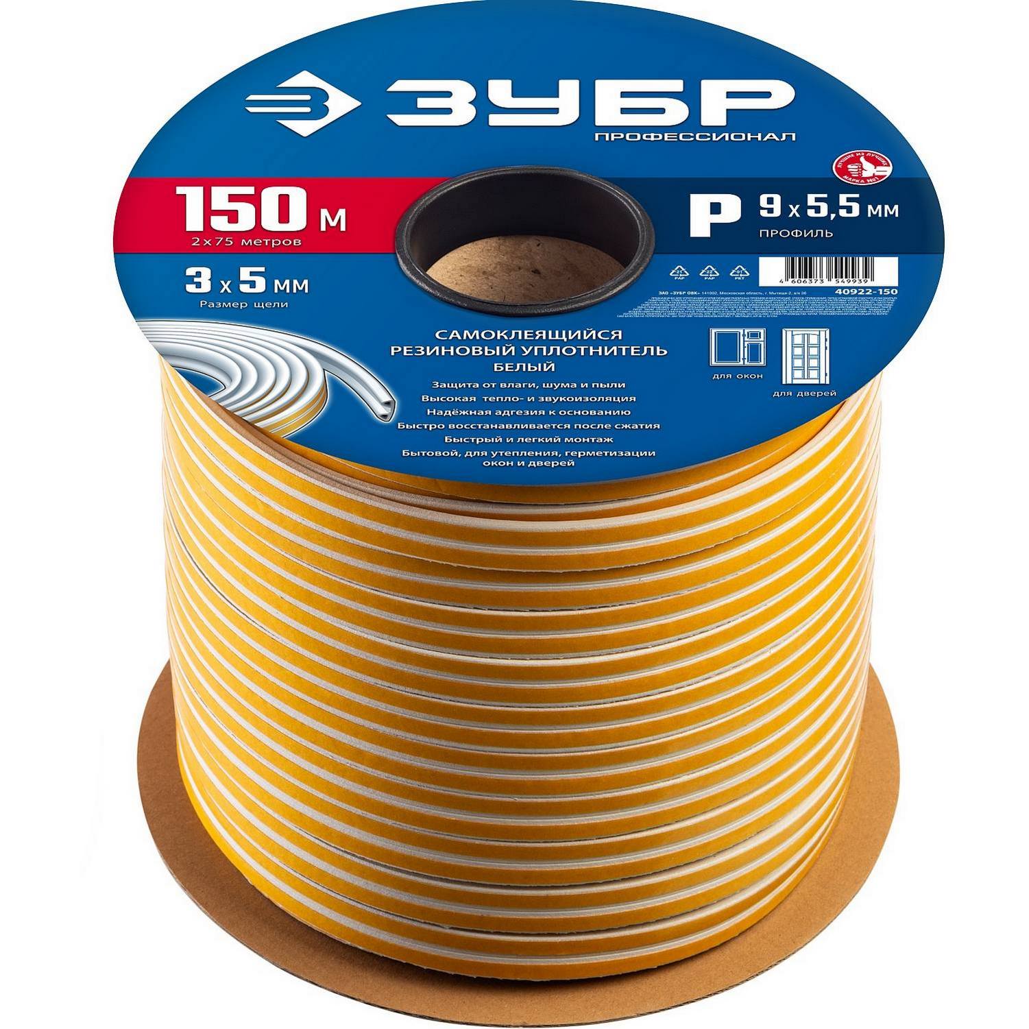 ЗУБР 150 м, P-профиль, размер 9 х 5.5 мм, белый, самоклеящийся резиновый уплотнитель, Профессионал (40922-150)