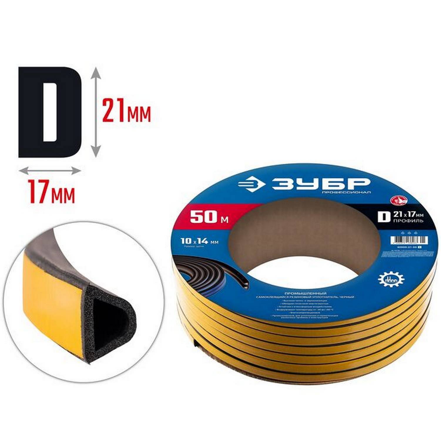 ЗУБР 50 м, D-профиль, размер 21 х 17 мм, черный, самоклеящийся промышленный резиновый уплотнитель, Профессионал (40950-21-50)